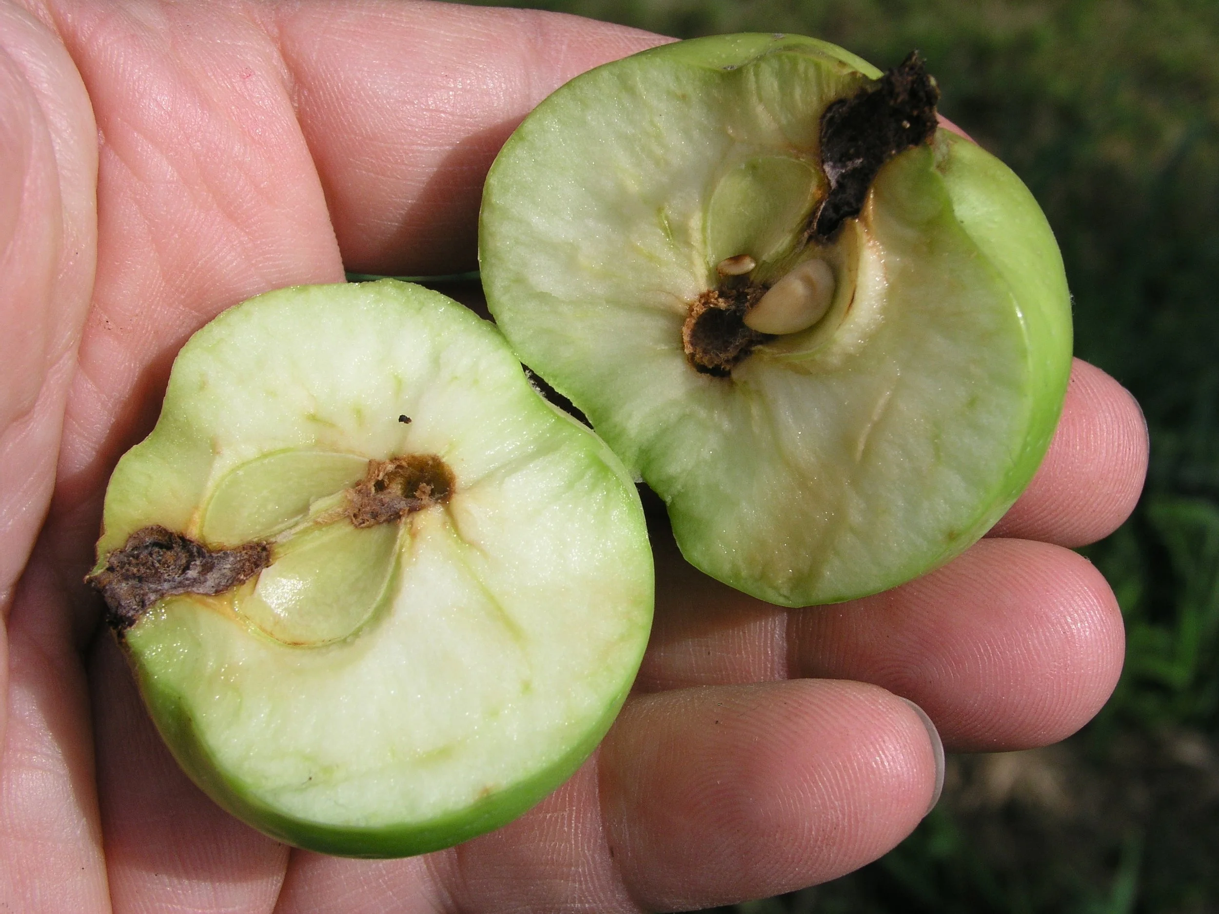 Larvae bore deep into the fruit and feed on the seed, making fruit unmarketable. Though still edible, infected fruit is unappetizing.